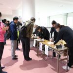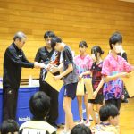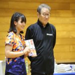 抽選会で、当選した参加者に 賞品を手渡す、西村卓二監督 と熊谷コーチ(ニッタク(株))