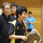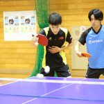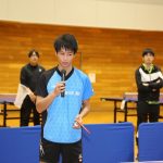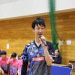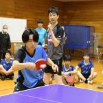 NTT東日本の櫻井智哉選手を お手本に“バックハンド”について 説明する藤本コーチ。